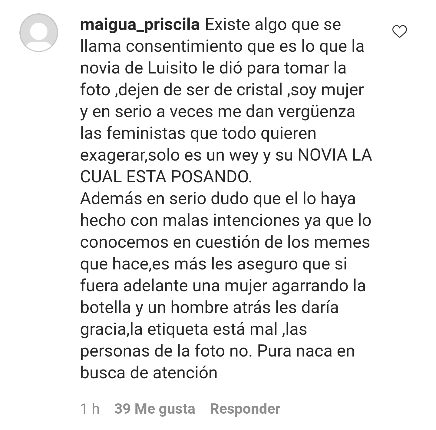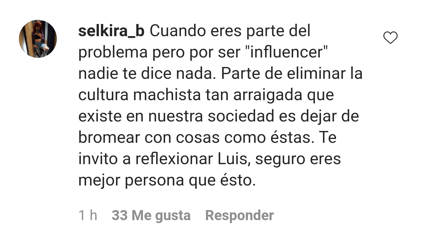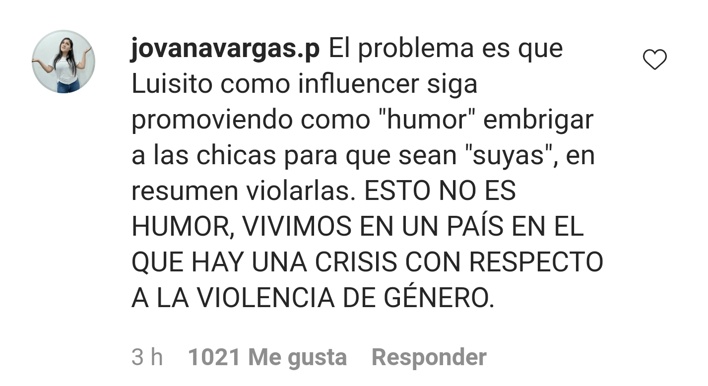 «El problema es que Luisito como influencer siga promoviendo como ‘humor’ embriagar a las chicas para que sean ‘suyas’, en resumen violarlas», comentó una usuaria de redes.