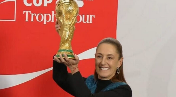 A 100 días del inicio del torneo, la mandataria mostró la emblemática copa ante medios de comunicación y subrayó que México volverá a ser anfitrión del máximo evento del futbol internacional, esta vez junto a Estados Unidos y Canadá.
