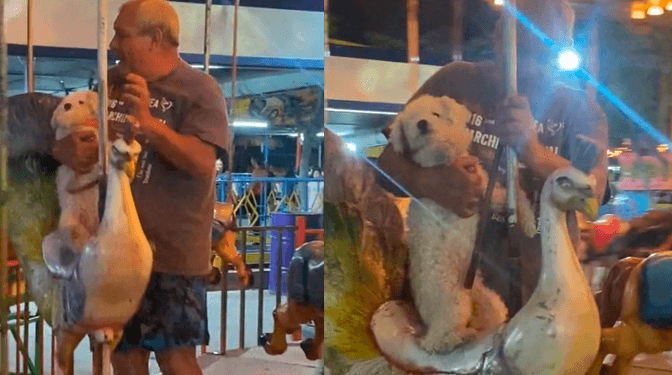 La escena se torna aún más enternecedora cuando el abuelito sostiene a su compañero perruno en brazos. La mascota, un adorable perrito, se acomoda en uno de los asientos del carrusel, creando una imagen que evoca sentimientos de ternura y conexión.