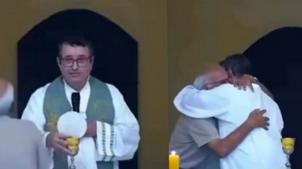 El hecho ocurrió el domingo 18 de enero y fue captado en video, mostrando cómo el hombre corrió hacia el altar y abrazó con fuerza al sacerdote Carlos Henrique, quien oficiaba la ceremonia, mientras rompía en llanto. En el clip, que rápidamente se volvió viral, se observa el instante en que el párroco se disponía a iniciar el rito de la comunión, y el adulto mayor sube las escaleras del altar en medio de la conmoción.