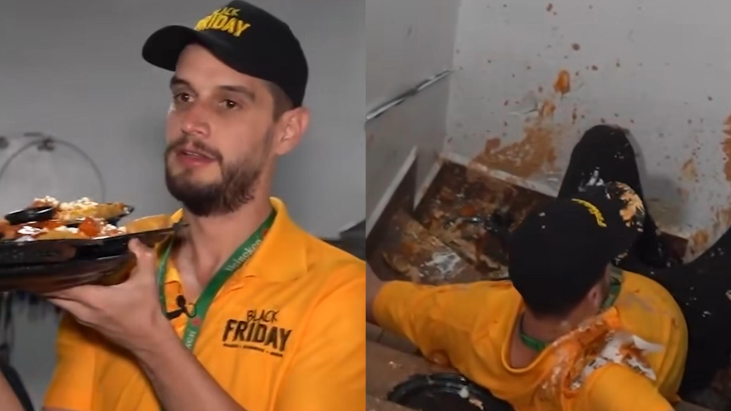 En las imágenes, se aprecia cómo Adrián Marcelo, con una bandeja llena de platos de comida, enfrenta dificultades al pisar el primer escalón de la escalera, provocando una aparatosa caída. Como resultado, todos los platillos se dispersan en el suelo, cubriendo al comediante con la comida destinada a los invitados.