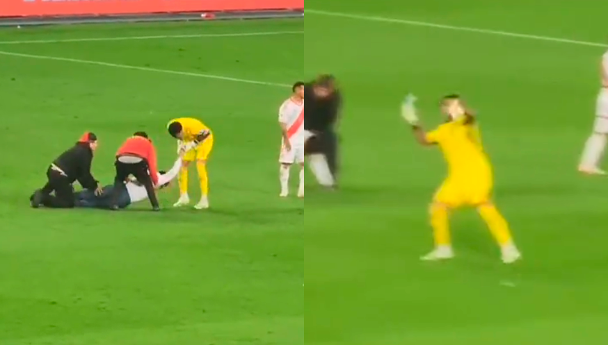 Visiblemente molesto por la situación, Gallese ayudó a detener al aficionado y le arrebató el celular que intentaba utilizar para tomarse una selfie con Messi. Acto seguido, el portero lanzó con fuerza el teléfono fuera del campo.