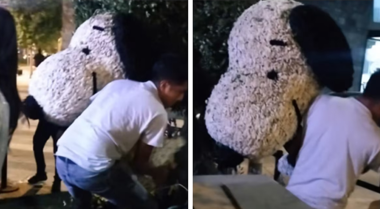La escultura —elaborada con flores blancas, negras y amarillas— recreaba al icónico personaje de Peanuts en un diseño que cautivó a asistentes. Ubicada cerca de una tienda de lujo, fue un punto focal para selfies durante los días del festival.