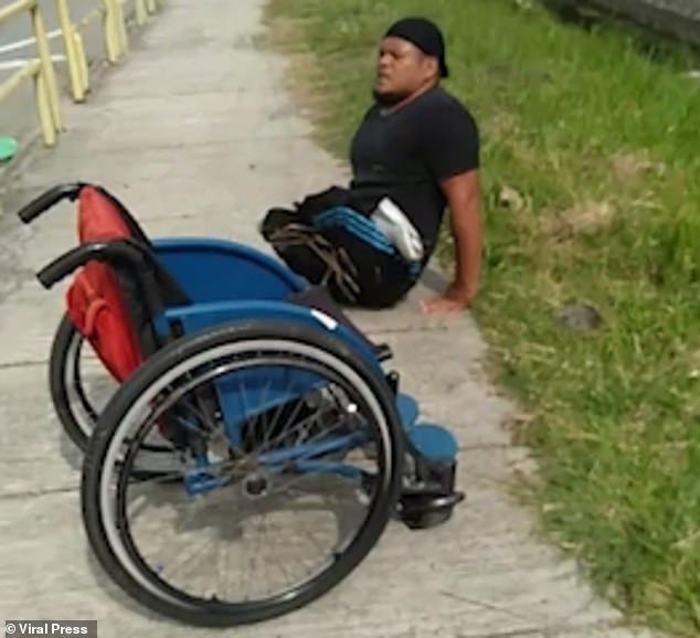 Sin embargo el atleta bajó de su silla de ruedas y se deslizó lentamente por una pendiente, hasta alcanzar al asustado felino y tomarlo para después dejarlo sobre el pasto.