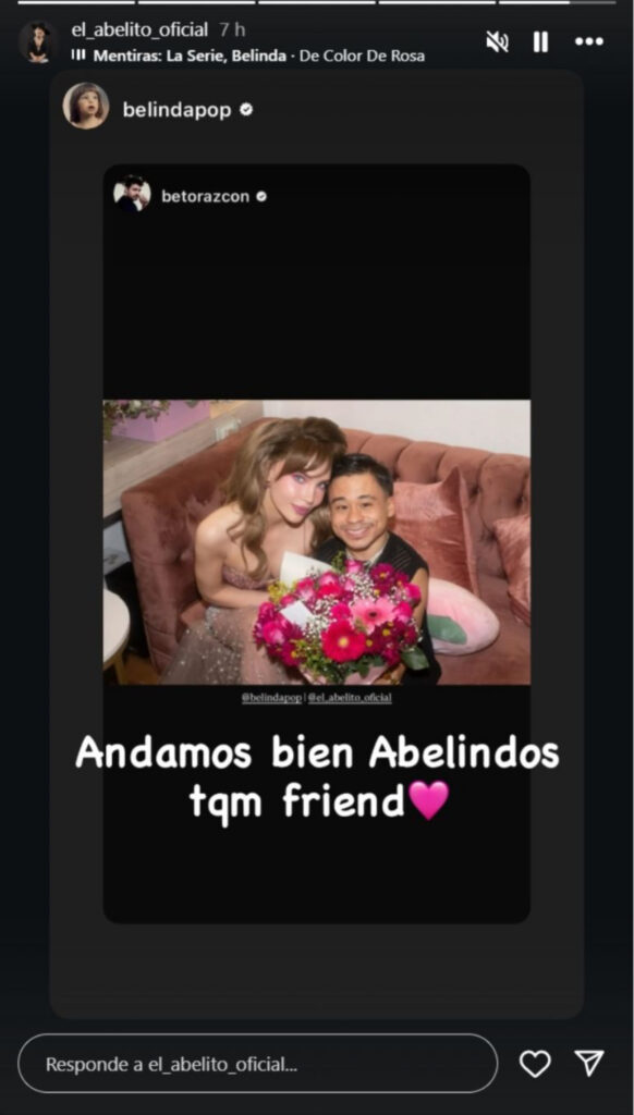 En videos compartidos en redes sociales, se aprecia a Belinda cargando entre risas al joven y mostrando visible agradecimiento por el detalle. Abelito compartió en sus historias de Instagram: «Andamos bien Abelindos, tqm friend», reflejando la cálida interacción entre ambos.