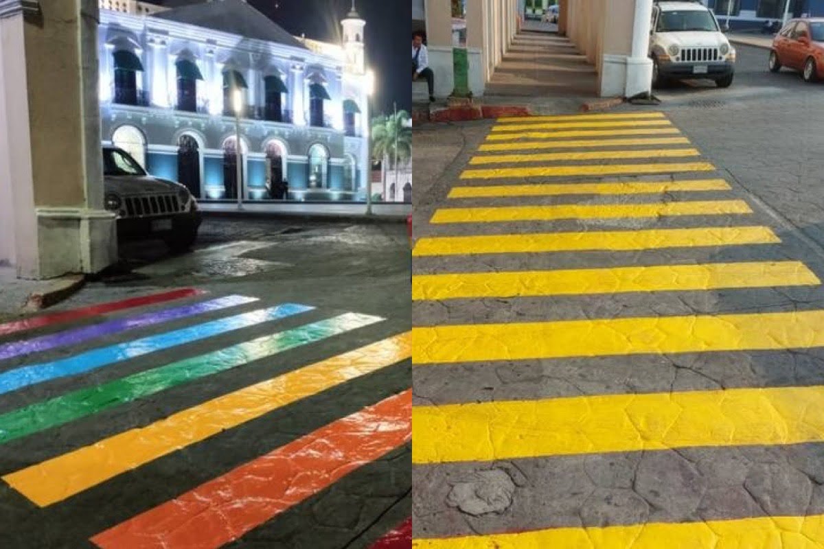«A solo 2 días de haber sido pintado con los colores de la bandera de la diversidad sexual, contando con la autorización correspondiente por parte de la dirección de Tránsito y la SSPC, el paso peatonal ubicado en la esquina de independencia y Nicolás Bravo en la colonia Centro, ya fue pintado de amarillo», expresó Dayana Torres Arias, delegada de la agenda LGBT en Tabasco.