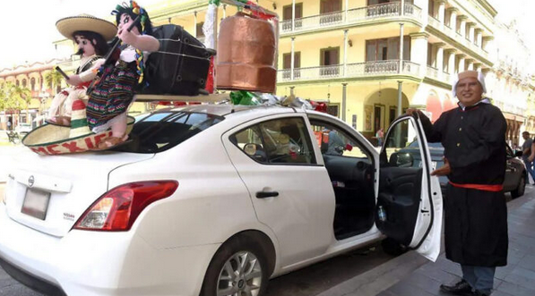 Se trata de don Gregorio Méndez, quien no solo se disfraza como el Padre de la Patria con vestimenta negra y cabello blanco, sino que además adornó su unidad con motivos alusivos a la Independencia de México. Sobre su coche destaca una Campana de Dolores con movimiento, luces LED, bocinas con música patriótica y hasta una antena Wi-Fi para uso gratuito de sus clientes.