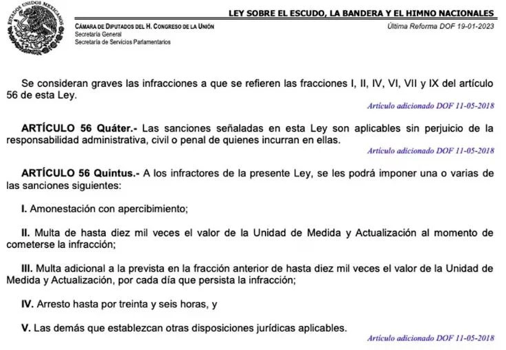 Desde un punto de vista económico, la multa por violar la tradición del Himno Nacional puede ser significativa. Esta sanción monetaria puede oscilar desde 10 mil veces el valor de la Unidad de Medida y Actualización (UMA) hasta la posibilidad de enfrentar un arresto de 36 horas.