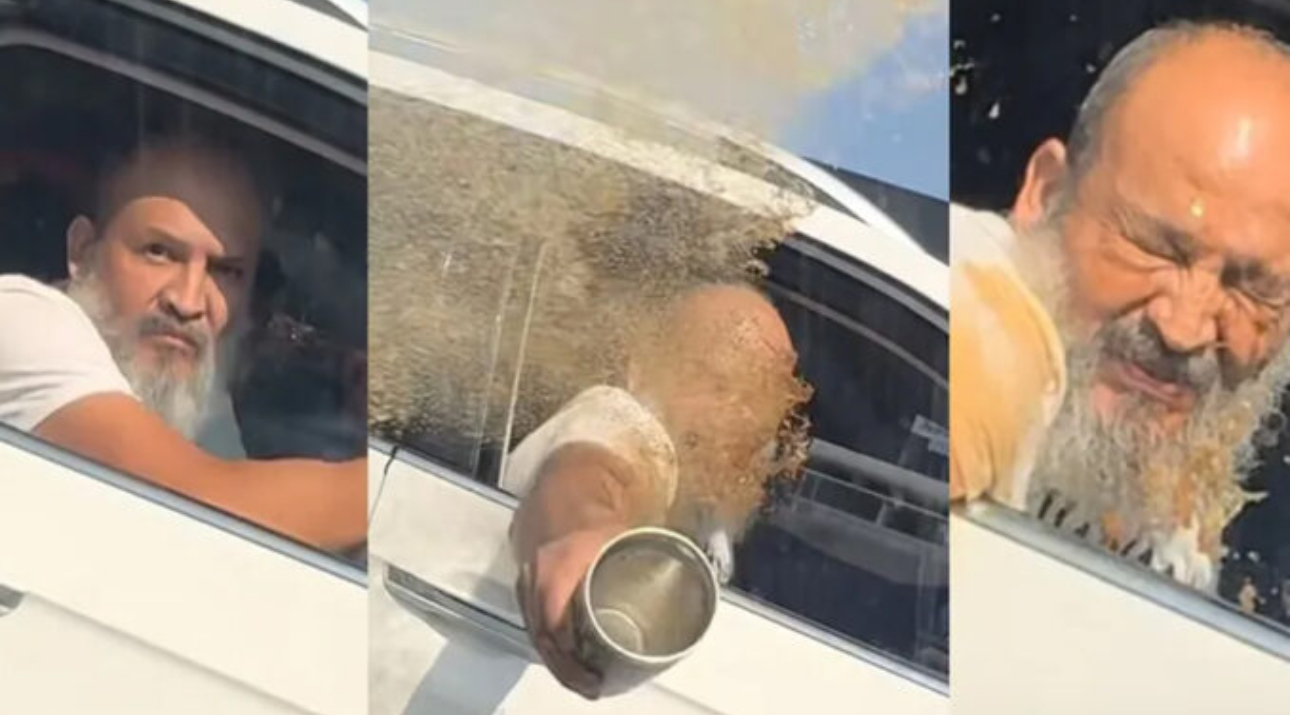 En las imágenes, se observa cómo la camioneta se empareja al auto del testigo, le cierra el paso y luego el copiloto baja el vidrio para grabarlo. Al tomar un termo y arrojar el líquido, el viento y el movimiento desvían el café hacia su propio rostro y brazo, generando una reacción de burlas en internautas.