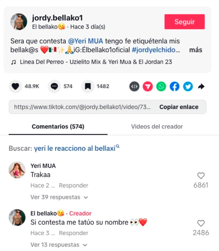 El joven tiktoker con el nombre de usuario @jordy.bellako1 hizo una promesa pública en TikTok: si Yeri Mua le comentaba en uno de sus videos en los que interpretaba su más reciente éxito, se tatuaría el nombre de la jarocha. Ante la respuesta positiva de la cantante, quien simplemente comentó con un «traka», el seguidor cumplió su palabra.