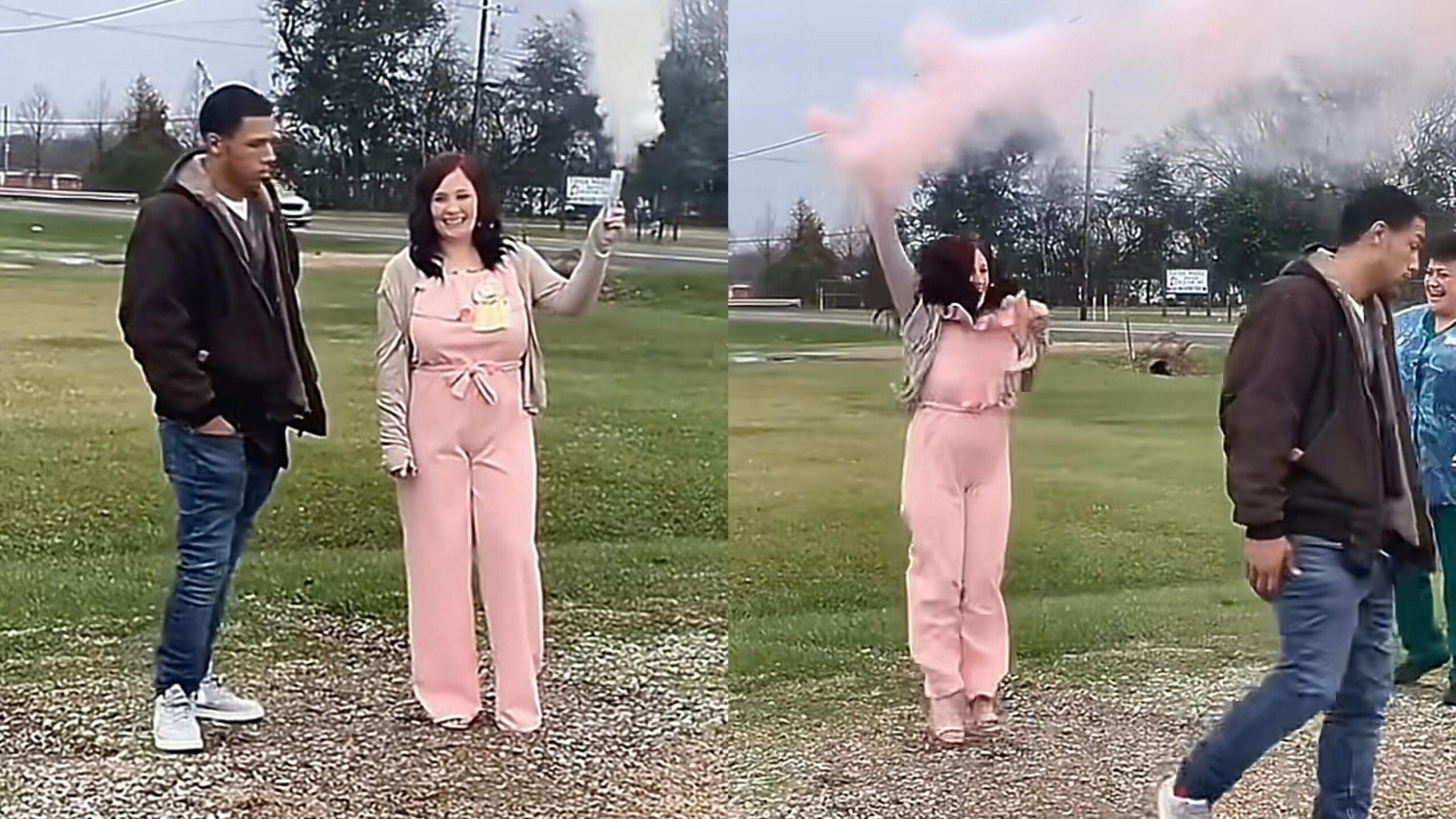 La vela de humo comienza a emanar un color rosa, revelando que están esperando una niña. La madre estalla de alegría y empieza a saltar de felicidad por el resultado, pero la reacción del padre es completamente inesperada. Retira las manos de sus bolsas y se aleja de la escena, mientras los asistentes graban la situación.