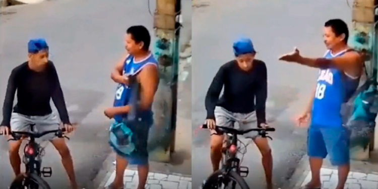 El video, compartido en la plataforma TikTok, muestra a un hombre vestido con una camiseta azul que espera en una esquina. De repente, se le acerca un joven en bicicleta que le exige que le entregue la mochila que lleva puesta.