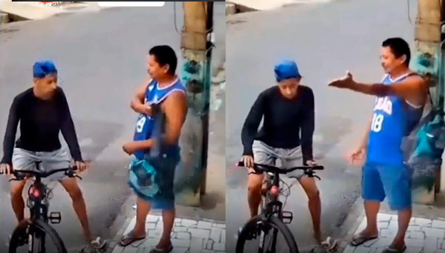 El video, compartido en la plataforma TikTok, muestra a un hombre vestido con una camiseta azul que espera en una esquina. De repente, se le acerca un joven en bicicleta que le exige que le entregue la mochila que lleva puesta.