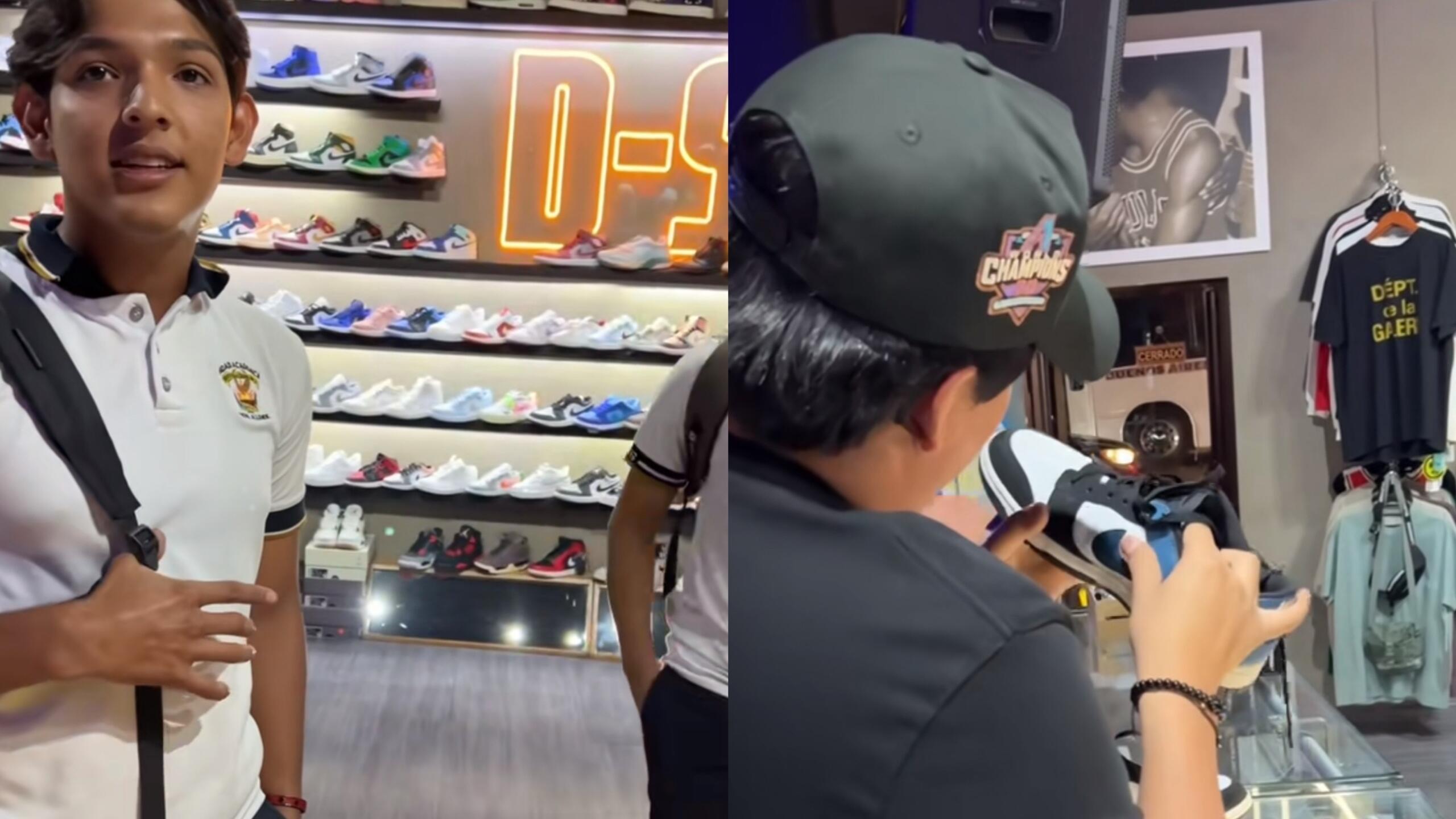 Los amigos, ataviados con uniformes estudiantiles, ingresan a una tienda especializada en tenis y se dirigen al mostrador. Con confianza, solicitan al vendedor que verifique la autenticidad de los Sneakers en cuestión, desatando la intriga en el lugar.
