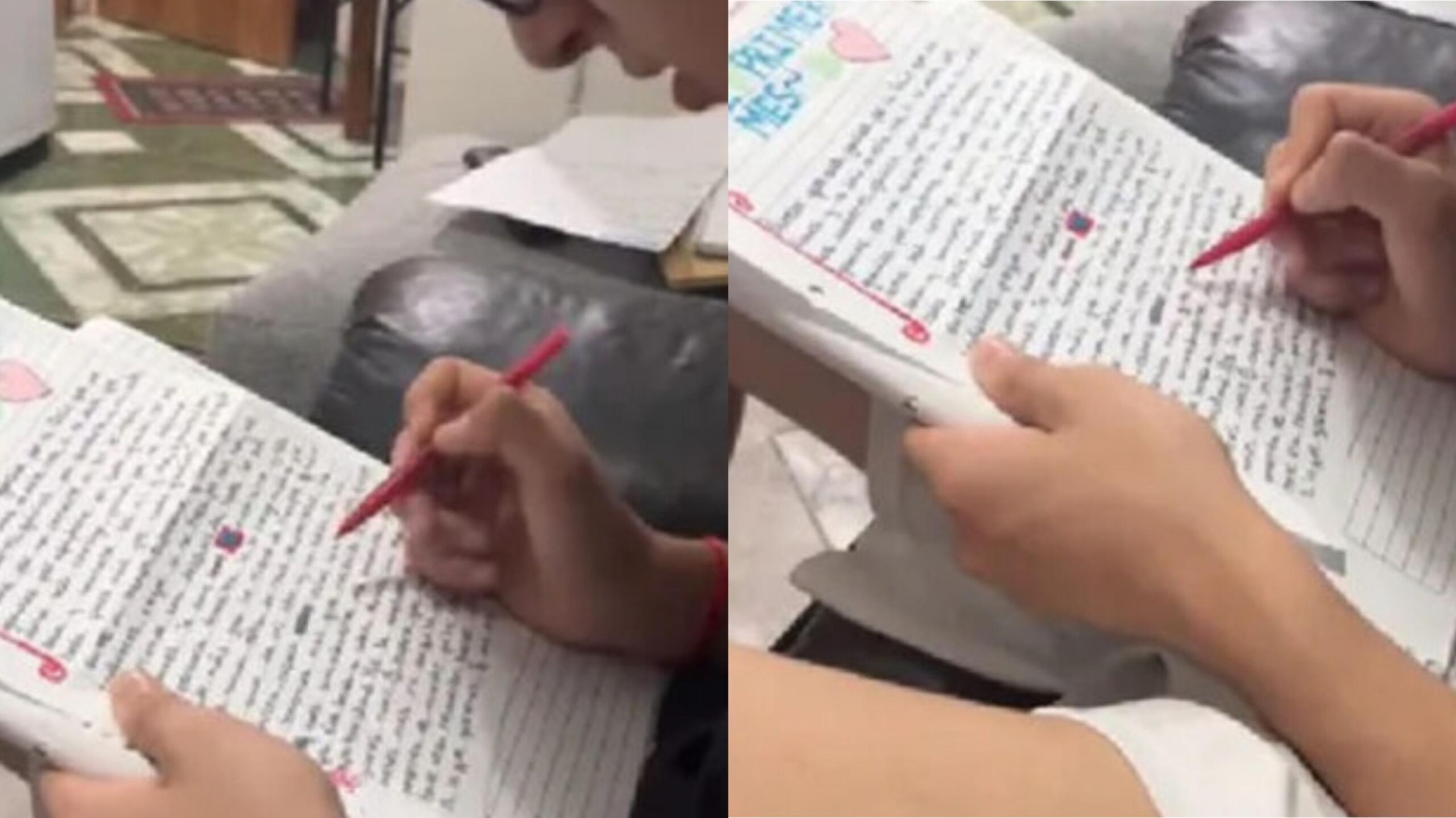 La joven capturó el curioso momento en video y lo compartió en redes sociales, donde rápidamente se volvió viral. En el video, se puede ver cómo la carta, inicialmente llena de sentimientos de amor, termina cubierta de señalamientos y correcciones en rojo.