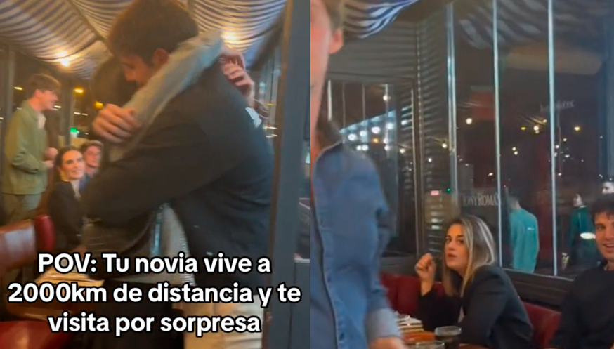 El video muestra a la joven ingresando al restaurante y sorprendiendo a su novio, quien estaba en medio de una cena con amigos. La sorpresa es evidente en las caras de todos los presentes, especialmente en la del joven, quien se lleva las manos al rostro antes de abrazar y besar a su novia. La mayoría de los amigos aplauden la emotiva reunión, pero llama la atención la reacción de una joven rubia que se encontraba sentada al lado del chico.