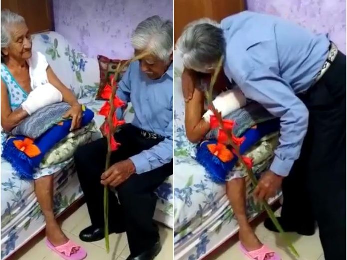 El abuelito, con una flor en mano, le declaró su amor eterno a su esposa, que se limitó a mirarlo y que después de todo, no pudo contener el llanto.