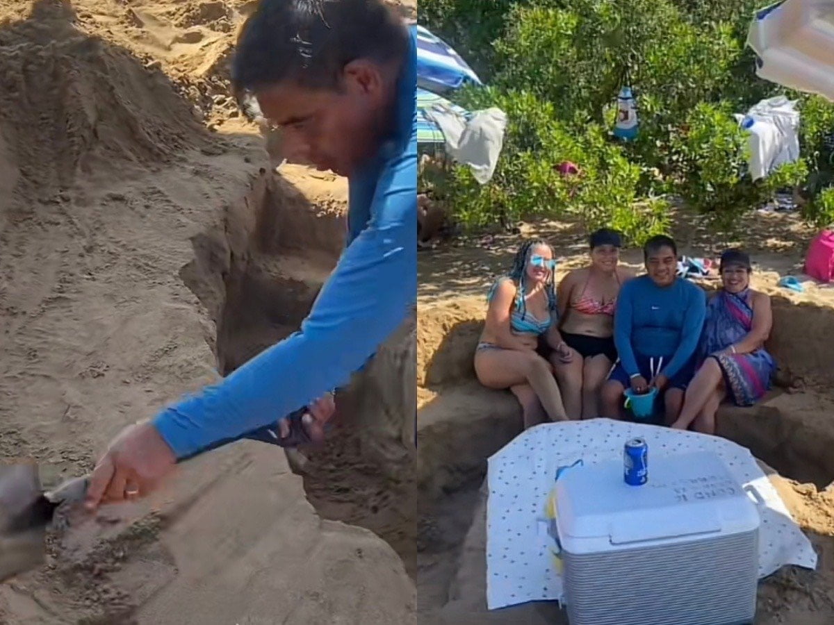 En el video que circula en redes se puede ver a la familia con una pala construyendo su mesa, a la que equiparon con escaleras, sombrillas, un mantel y una hielera.