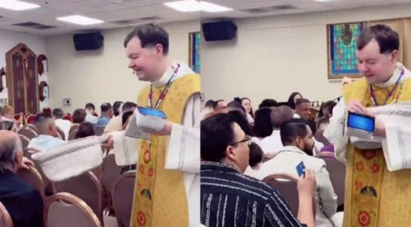 En la grabación, tomada en una parroquia de Las Vegas, se observa cómo el religioso recorre los pasillos con una canasta para donativos mientras ofrece también la opción de pago electrónico, permitiendo a los asistentes realizar aportaciones con tarjeta.