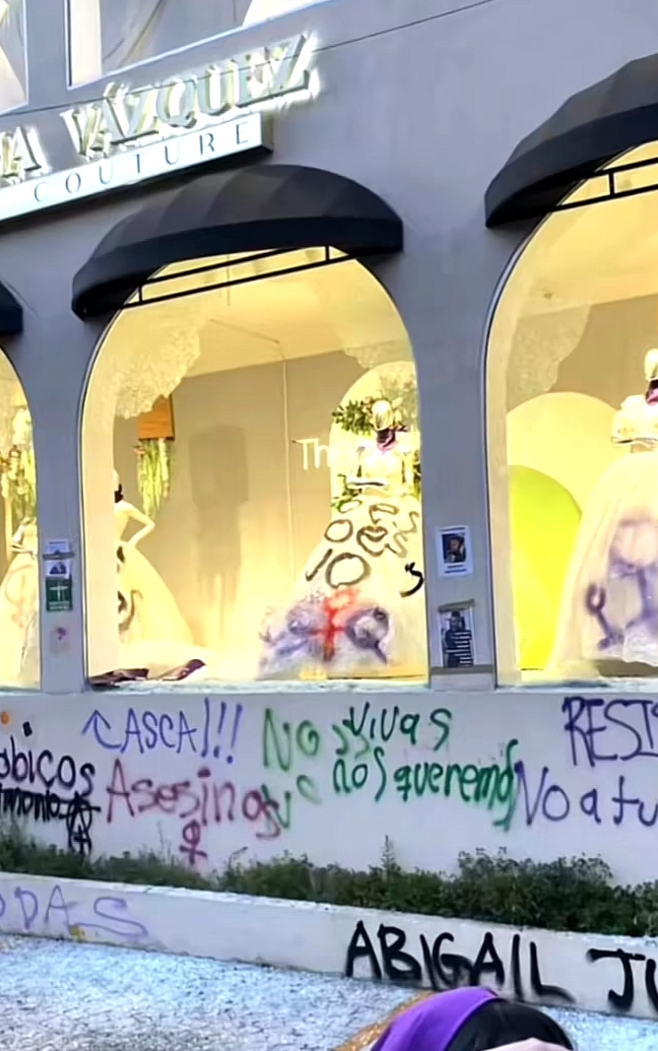 En otro incidente destacado, un grupo de mujeres fue captado destruyendo los cristales de entrada de una tienda de vestidos de novia en Guadalajara. Sorprendentemente, la tienda tenía carteles de apoyo al movimiento feminista en su entrada, lo que ha generado comentarios en línea sobre la contradicción entre el mensaje de la tienda y la acción de las manifestantes.