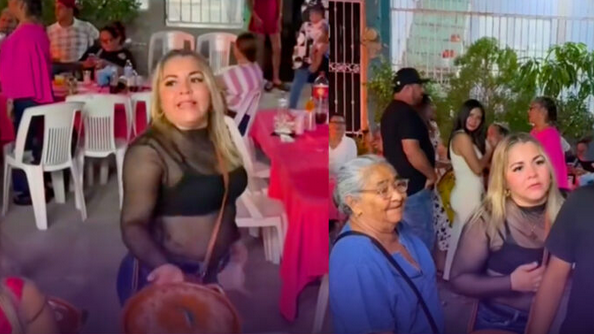 “Si ya te servimos cinco”, se escucha decir a la mujer que estaba sirviendo la comida. La respuesta desató la furia de la invitada, quien gritó: “Chi…gada madre, un taco, ¿qué te cuesta?” para después aventar una cazuela con los guisos al suelo, derramando toda la comida frente a los asistentes.