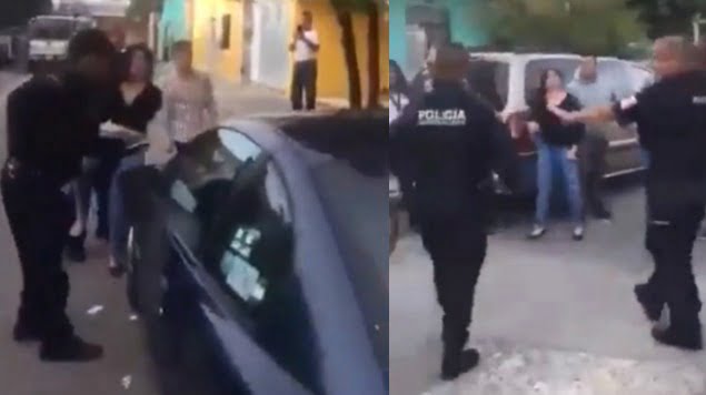 Después, otro policía intenta detener a la mujer, uno se acerca a ella y le golpea la cara.