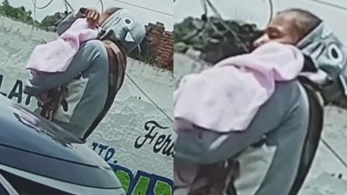 El video, que rápidamente se volvió viral en las redes sociales, muestra a una mujer de mediana edad vestida con pantalones de mezclilla y una sudadera gris. En sus brazos, supuestamente sostiene a un recién nacido cubierto con una manta rosa. Además, lleva una mochila morada que pretende pasar por una pañalera.