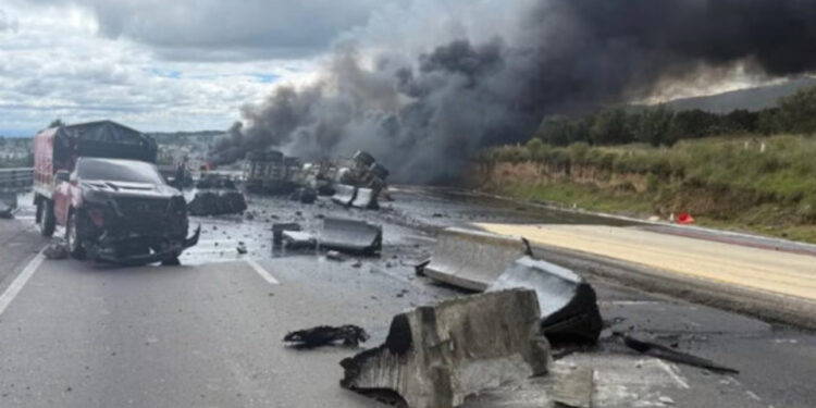 Una pipa que transportaba combustóleo chocó contra un tractocamión y explotó en el kilómetro 72, provocando un incendio que obligó al desalojo de viviendas y cierre de la carretera en ambos sentidos.
