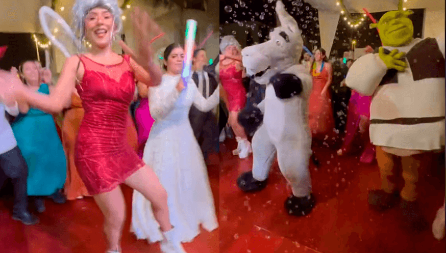 Sin embargo, lo que más sorprendió tanto a los novios como a los asistentes fue la aparición de Shrek en la boda. Un actor vestido con la característica botarga del ogro hizo su entrada en un momento destacado del evento, añadiendo un toque único a la celebración.