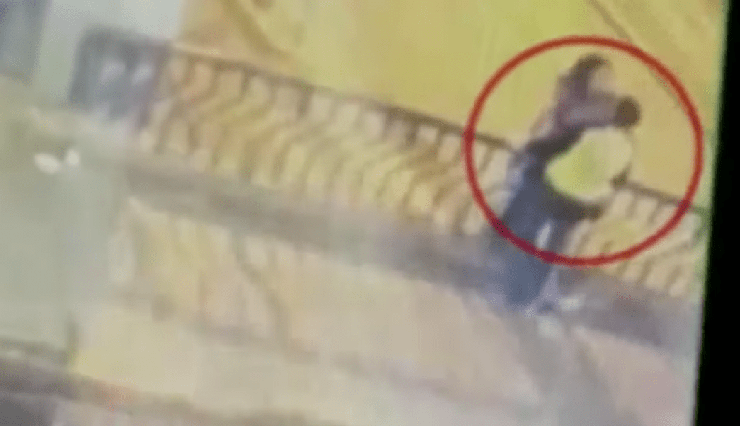 Según se observa en las imágenes, la jovén se sienta en la baranda del puente peatonal, enredando sus piernas en la cintura de su pareja, tras platicar por unos segundos, la mujer pierde el equilibrio y se balancea de espaldas.