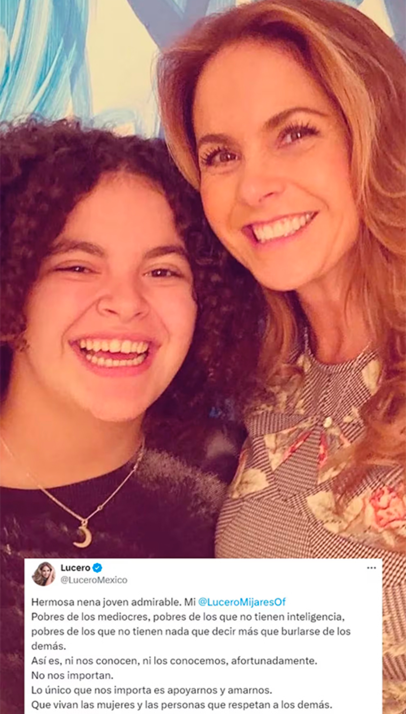 Ante esta situación, Lucero decidió salir en defensa de su hija a través de su cuenta de Twitter. En un mensaje contundente, la cantante expresó su apoyo incondicional a Lucero Mijares y arremetió contra aquellos que se burlaron de ella. «Hermosa nena joven admirable. Mi @LuceroMijaresOf. Pobres de los mediocres, pobres de los que no tienen inteligencia, pobres de los que no tienen nada que decir más que burlarse de los demás», escribió Lucero en su publicación.