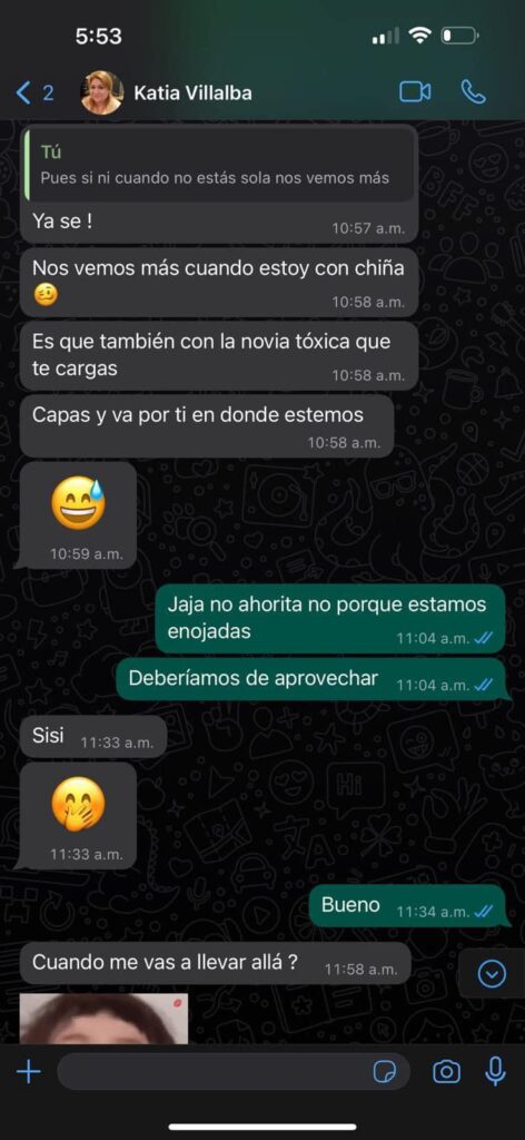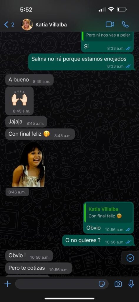 En estas imágenes, Salma exponía a su pareja preguntándole si esta señora lo visitaría esa noche. La respuesta de Katia, que indicaba que sí lo haría pero que no le prestaba mayor atención a la situación, dejaba entrever una posible conexión entre ambos.