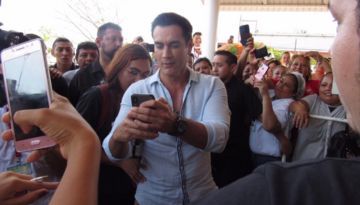 Este fin de semana, una admiradora imprimió sus fotografías íntimas y le pidió al actor que se lo autografiara. La admiradora se lo pide al oído y a pesar de que se sonrojó el actor no dudó en regalarle su autógrafo.